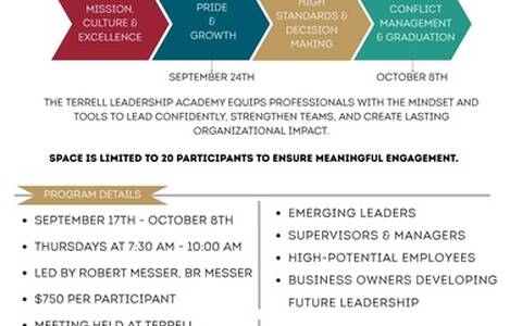 Terrell Leadership Academy is a leadership development program presented by the Terrell Chamber of Commerce for Chamber member businesses. The Academy equips professionals with the mindset and skills needed to lead confidently, strengthen teams, and create lasting organizational impact.